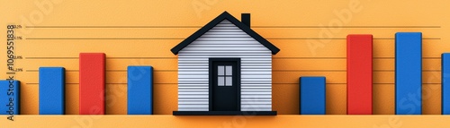 Fototapeta premium A colorful illustration showing a house between rising blue and red bar graphs, representing housing market trends and statistics.