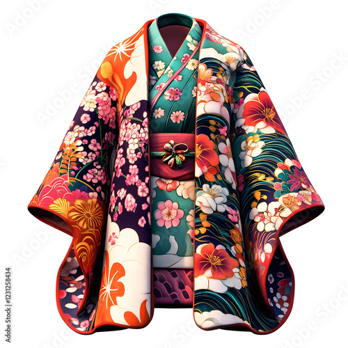 Naklejka premium A colorful kimono with intricate sakura and wave patterns, beautifully folded
