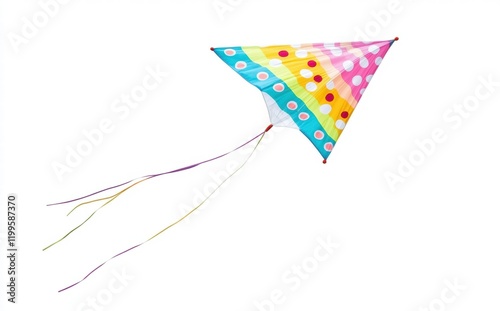 Fototapeta premium A colorful kite with a rainbow pattern and polka dots is flying in the air