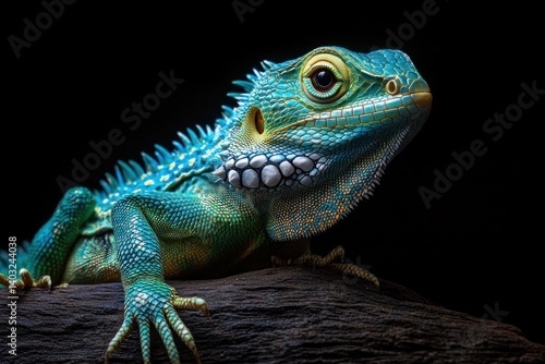 © Alokya, Fototapeta premium A Colorful Lizard Posing On Dark Brown Wooden Surface