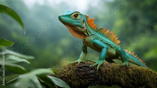 © larrym, Fototapeta premium A Colorful Lizard Resting Gracefully on a Moss Covered Branch