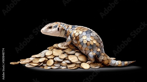 Fototapeta premium A colorful lizard sits atop a large pile of coins, combining themes of wealth...