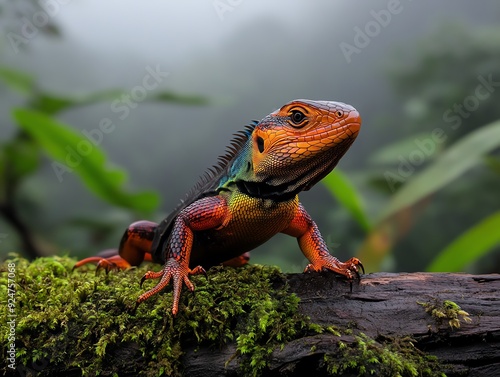 Obraz premium A colorful lizard standing alert on a mossy log, misty jungle setting, soft...