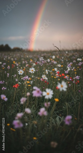 Naklejka premium A Colorful Meadow with a Rainbow, a Peaceful Scene