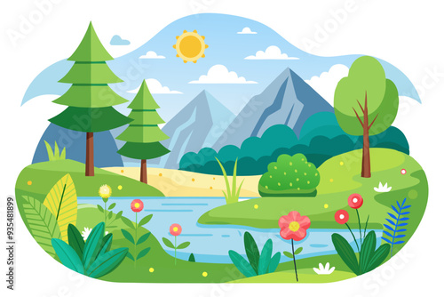 © cihuy, Obraz premium A Colorful Mountain Landscape with a Winding River and Bright Flowers