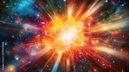 © Niken, Fototapeta premium A colorful nebula in space with shooting stars, featuring orange and red hues