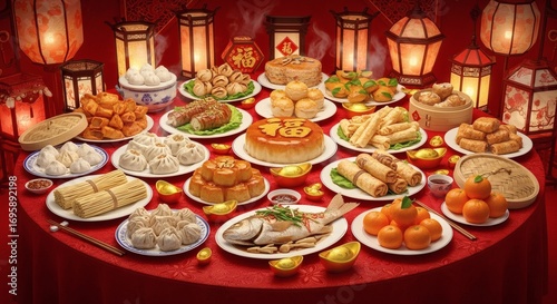 © Bias, Naklejka premium A colorful New Year banquet display has symbolic dishes with realistic food textures.