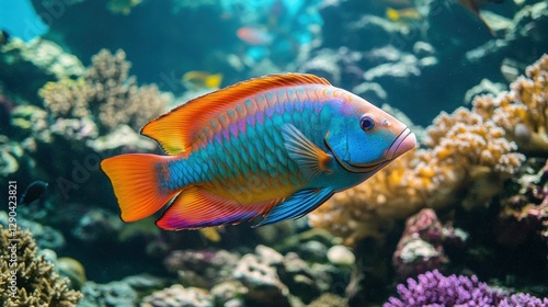 © linlies, Fototapeta premium A colorful parrotfish grazing on coral in a shallow reef, with a pristine marine ecosystem in the background.