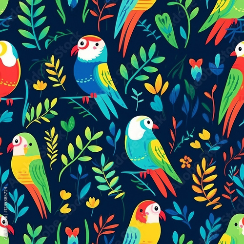 © siriwan, Fototapeta premium A colorful pattern of birds is displayed on a blue background