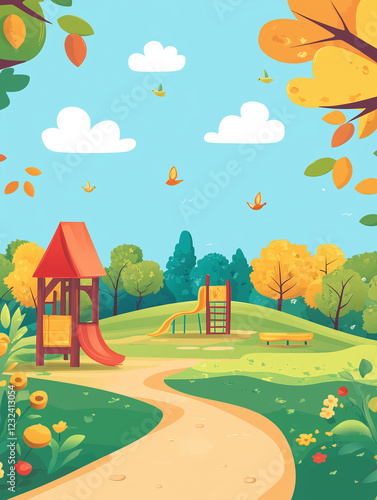 © s1llu, Fototapeta premium A colorful playground scene featuring a red slide, climbing structure, and a winding path. Surrounding trees display autumn colors with yellow and orange leaves.