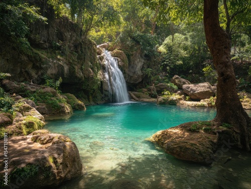 Naklejka premium A Colorful Pool At The Base Of A Tropical Waterfall