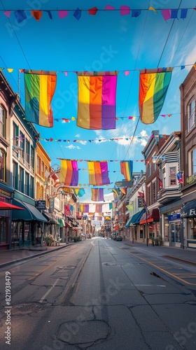 © GoodRNG, Fototapeta premium A colorful Pride Month banner hanging over a main street with shops and cafes below