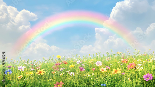 © Elnare, Naklejka premium A colorful rainbow arches over a field of wildflowers.