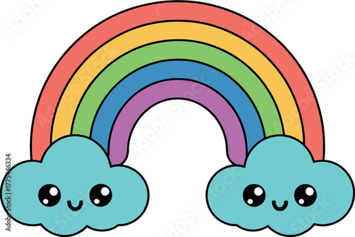 Obraz premium A colorful rainbow arches over two cute, smiling clouds with big eyes.