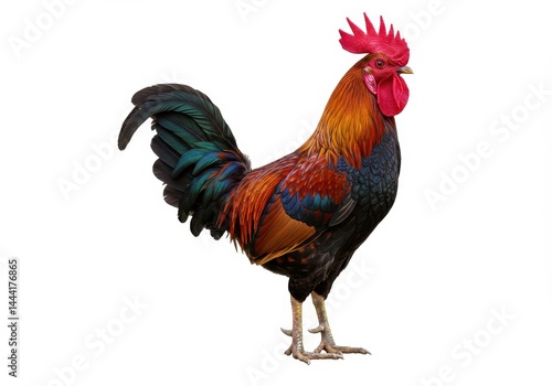 © Muaz, Fototapeta premium A colorful rooster standing on a white background with its feathers displayed prominently and clearly