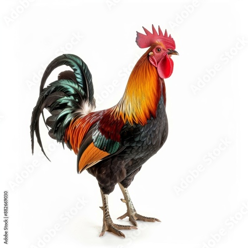 Fototapeta premium A colorful rooster stands proudly against a white background, showcasing its...