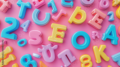 Fototapeta premium A colorful set of toy letters and numbers on a pastel pink backdrop, leaving...