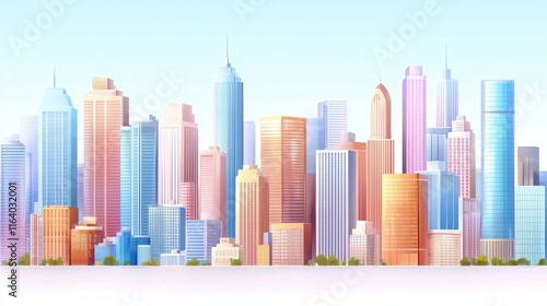 © Sirilak, Fototapeta premium A colorful skyline illustration featuring various skyscrapers under a clear blue sky, showcasing modern urban architecture.