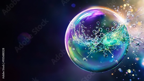 © VISUAL BACKGROUND, Obraz premium A colorful soap bubble with water splashing out of it