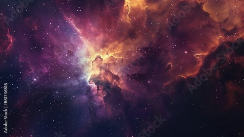 Naklejka premium A colorful space scene with a large cloud of purple and orange. The stars are scattered throughout the image, with some closer to the foreground and others further away. Scene is one of wonder and awe