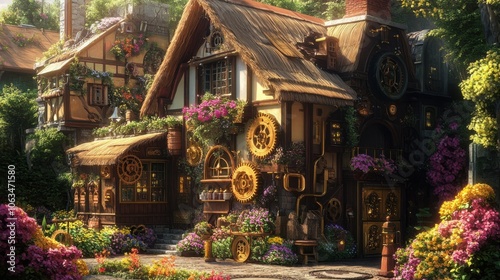 Naklejka premium A colorful steampunk house with a thatched roof