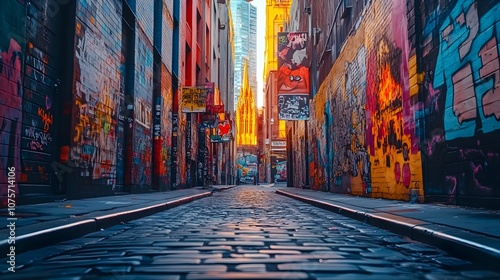 Fototapeta premium A colorful street art mural transforming a gray alley into a lively visual...