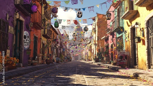 Fototapeta premium A colorful street scene with vibrant flags hanging across, wooden tables, and...