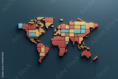 Obraz premium A colorful, stylized map of the world is constructed from rectangular blocks,...