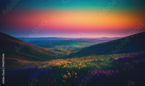 © Miklos, Fototapeta premium A colorful sunrise over the mountains, casting a soft glow on the wildflowers below