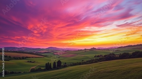 © phy, Obraz premium A colorful sunset over rolling hills and fields, providing a warm and vibrant nature background