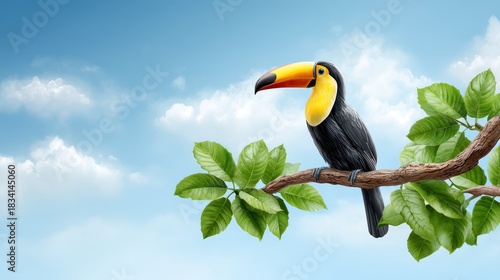 © stardadw007, Naklejka premium A colorful toucan perched on a branch amidst green leaves and a bright blue sky with fluffy clouds.