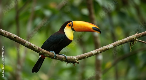 Fototapeta premium A colorful toucan perches on a branch in a lush green environment