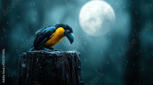 © Dulemegapixel, Obraz premium A colorful toucan stands against a rainy moonlit backdrop, evoking feelings of melancholy and contemplation in a captivating natural setting.