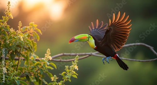 © Md, Obraz premium A colorful toucan with a green beak soars through golden light.