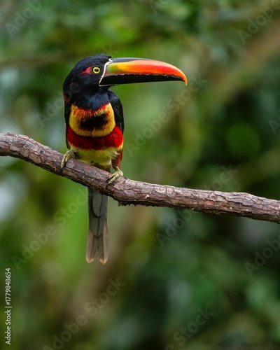 © Udean spinal, Fototapeta premium A colorful toucan with a large beak perched on a tropical tree branch in the rainforest