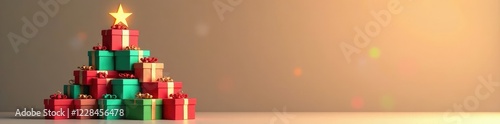 © suchetpong, Obraz premium A colorful triangular shape made from stacked boxes forms the top of a Christmas tree, , gift packing