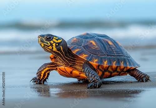 Obraz premium A Colorful Turtle Walking on the Sandy Beach Shoreline with Soft Ocean Waves...