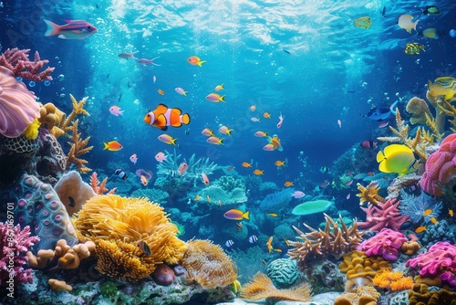 Naklejka premium A colorful underwater scene featuring vibrant coral reefs, tropical fish, and...