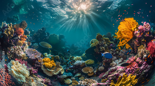 Naklejka premium A colorful underwater scene with a variety of fish and coral