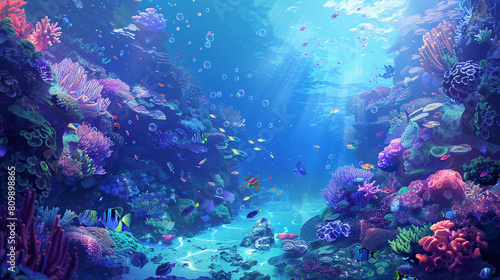 Naklejka premium A colorful underwater scene with a variety of fish and coral. Cartoon style.
