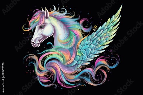 © Friedbert, Fototapeta premium A colorful unicorn with wings on a black background