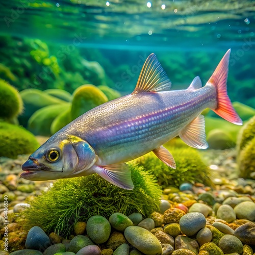 Naklejka premium a colorful whitefish gliding near a rocky streambe.jpg