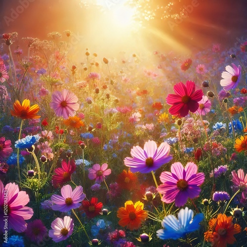 © Владимир Стеблев, Obraz premium A colorful wildflower meadow in full bloom, with soft sunlight streaming through, casting a warm glow on the vibrant petals