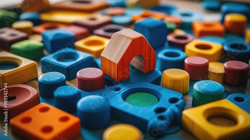 Naklejka premium A colorful, wooden play mat with various shapes and textures, encouraging sensory play.