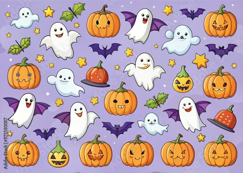 Naklejka premium A colorful worksheet featuring friendly ghosts, bats, and pumpkins,...
