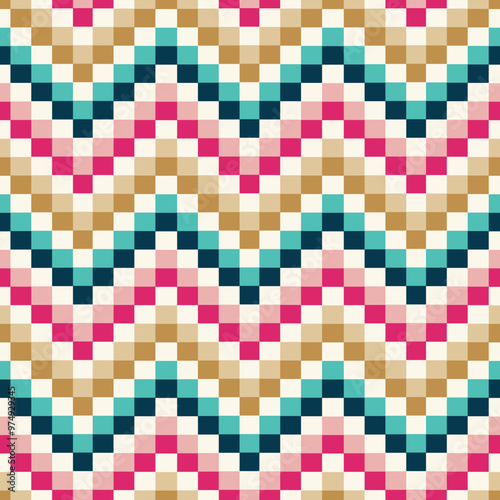 Fototapeta premium A colorful zigzag pattern featuring alternating waves of pink, teal, beige, and cream squares.
