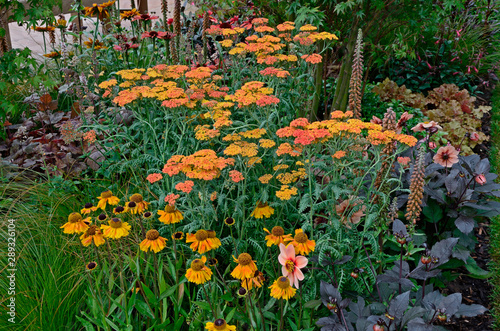 Obraz premium A colourful flower border with Achillea millefolium Paprika and Heleniums