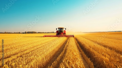 Fototapeta premium A combine harvester is working in a field of golden wheat. The image captures...