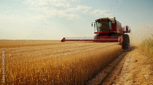 © Focus, Obraz premium A combine harvester working in a golden wheat field under a blue sky.