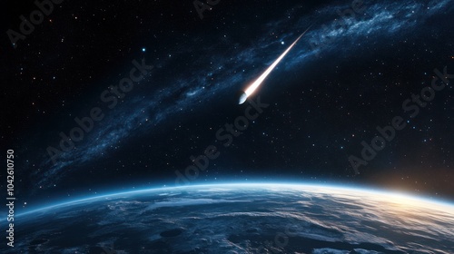 Fototapeta premium A comet passing close to Earth, highly detailed surface textures of both celestial bodies, vibrant space colors, natural lighting effects.